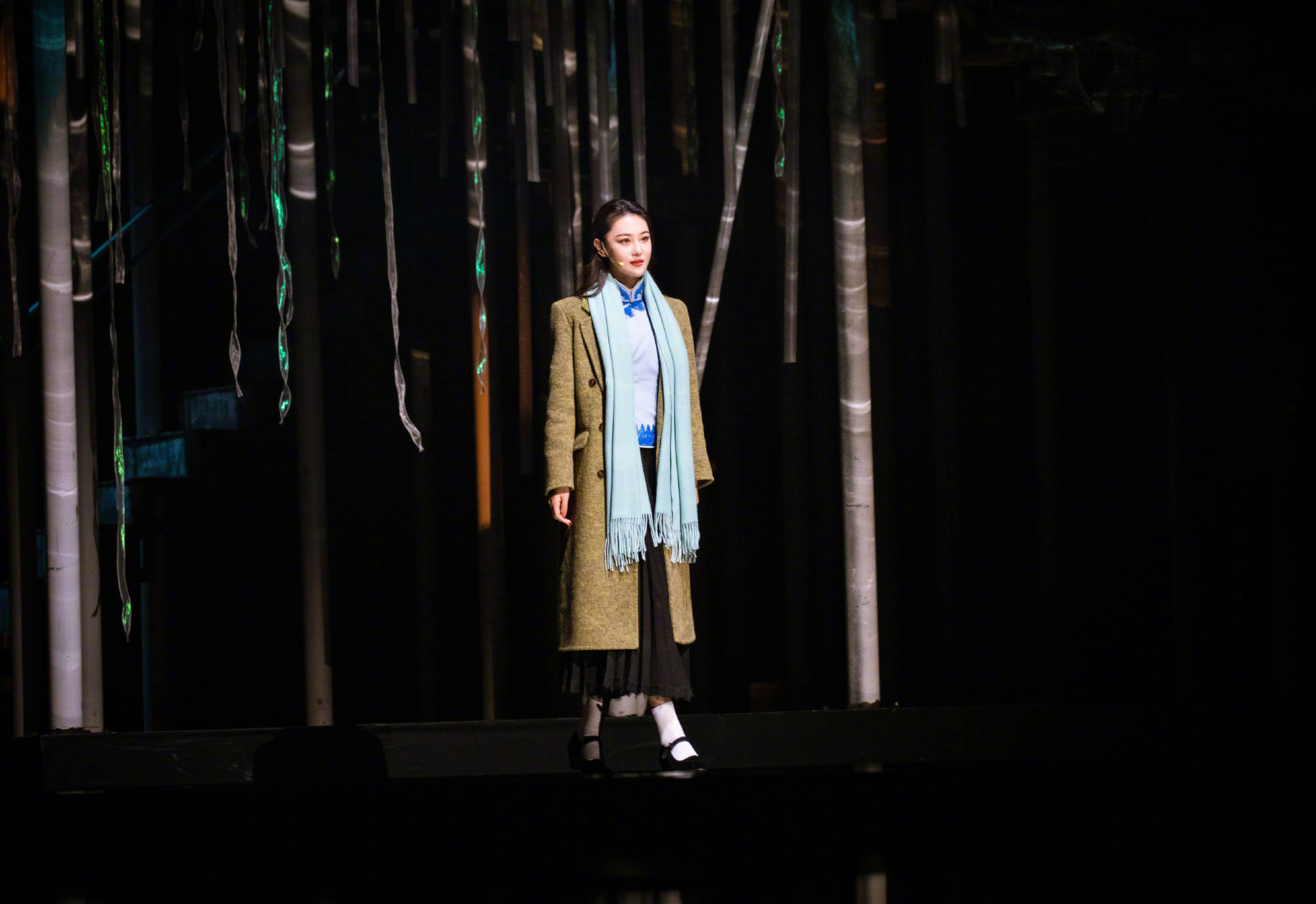 张馨予登台演绎费达生,大衣造型尽显温婉力量。