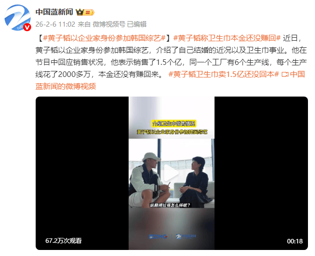 近日,黄子韬以企业家身份参加韩国综艺,介绍了自己结婚的近况以及卫生巾事业。他在节目中回应销售状况,他表示销售了1.5个亿,同一个工厂有6个生产线,每个生产线花了2000多万,本金还没有赚回来。