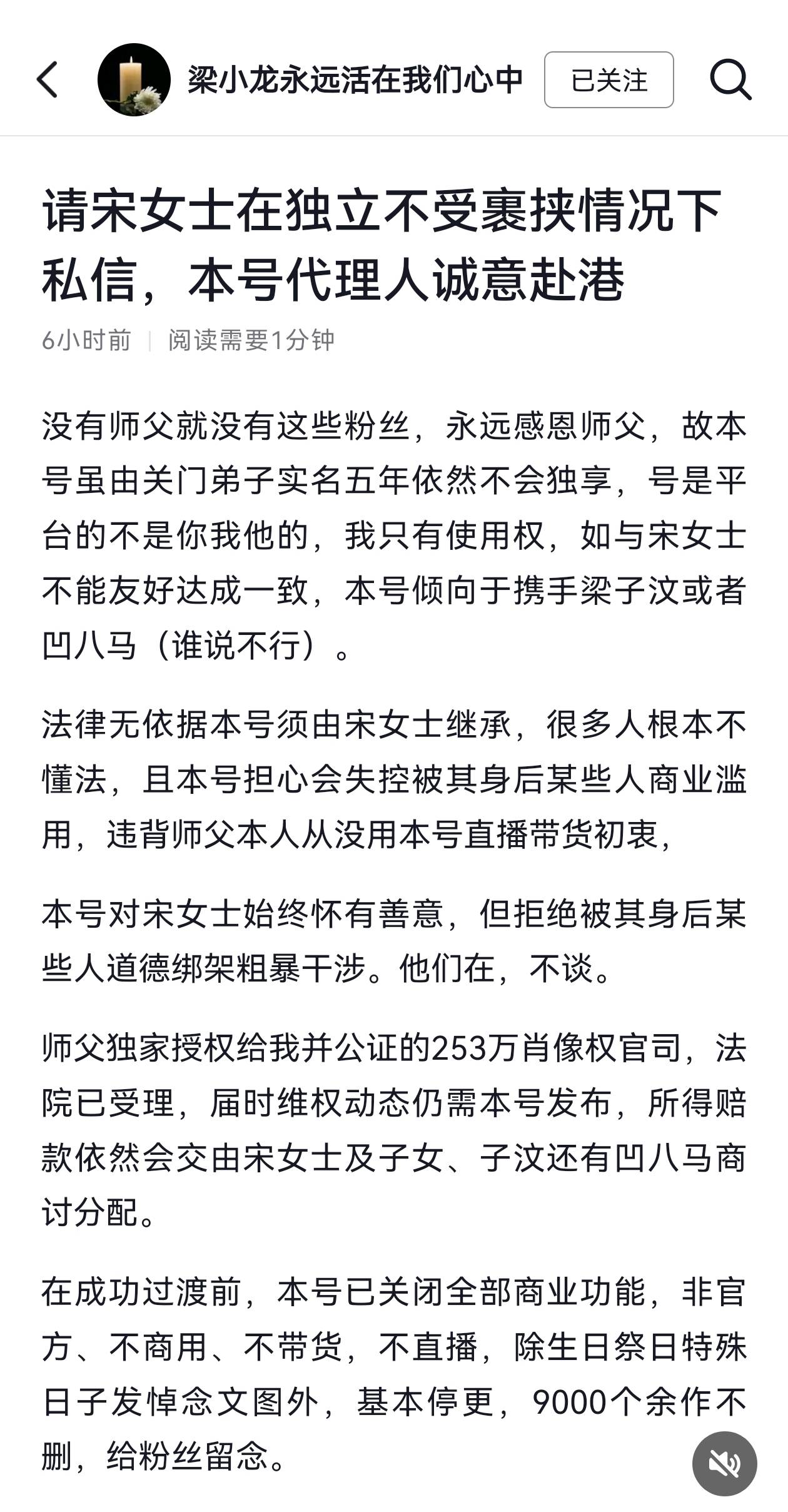 2月7日,梁小龙相关账号再次发文回应:“法律无依据本号须由宋女士继承,且本号担心会失控被其身后某些人商业滥用,违背师父本人从没用本号带货初衷。本号对宋女士始终怀有善意,但拒绝被其身后某些人道德绑架粗暴干涉。”