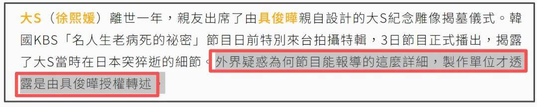 纪念活动刚结束,韩国媒体便开始大篇幅报道具俊晔与大S的“世纪之恋”。