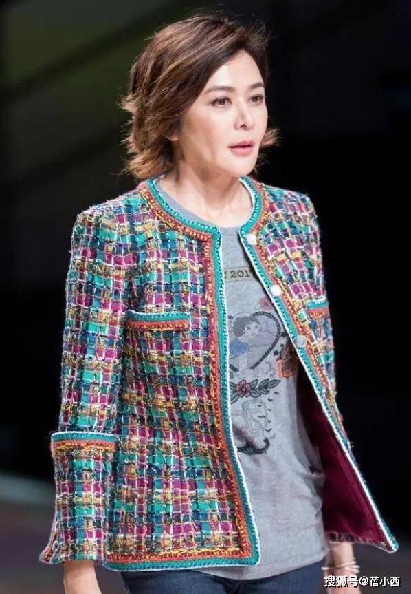 为了不抢走外套的风头,关之琳选择了灰色圆领 T 恤作为内搭。低饱和度的底色起到了很好的中和作用,让整体造型在绚烂之余保持了呼吸感。下身搭配的深色牛仔裤更是点睛之笔,修身裤型拉长了腿部线条,牛仔面料的休闲感与粗花呢的奢华感形成巧妙碰撞。这种 “上繁下简” 的搭配思路,完美诠释了松弛感穿搭哲学。没有刻意堆砌大牌单品,也没有用力凹造型,却通过色彩与材质的平衡,让整体造型既华丽又日常,成熟女性也能轻松驾驭。