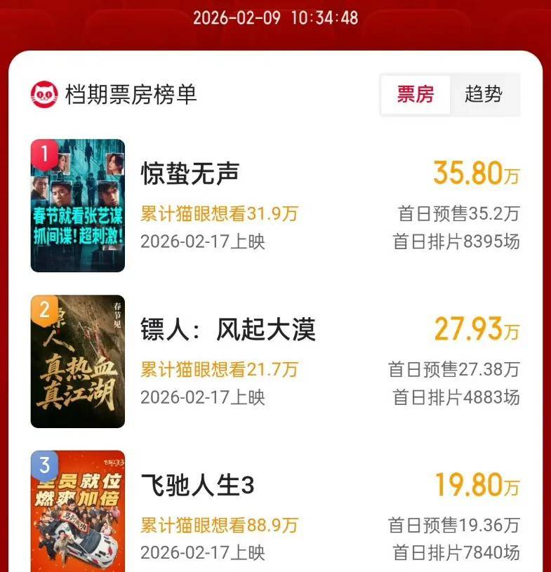 第一档正是《飞驰人生3》和《惊蛰无声》,二者坐二望一,争夺预售票房第一,都是春节档票房冠军种子;