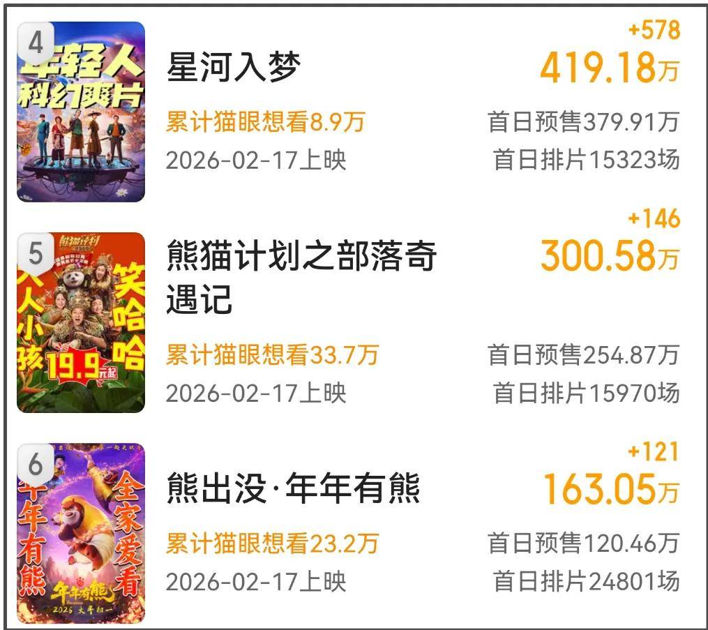 再来就是《星河入梦》,王鹤棣和宋茜主演,典型粉丝电影,排片垫底、预售票房倒数,大概率会是2026年春节档第一个掉队的炮灰。