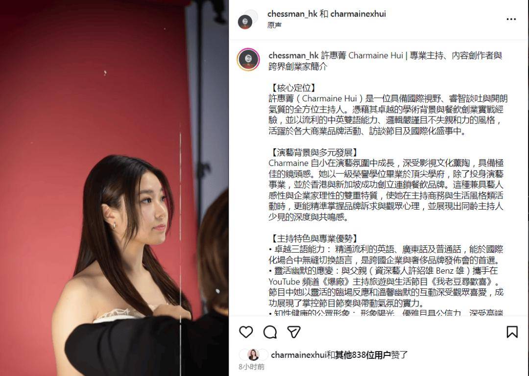 今日,许惠菁在社交网宣布新动向,她将加入林盛斌(Bob)旗下的棋人娱乐,主力往主持方向发展。