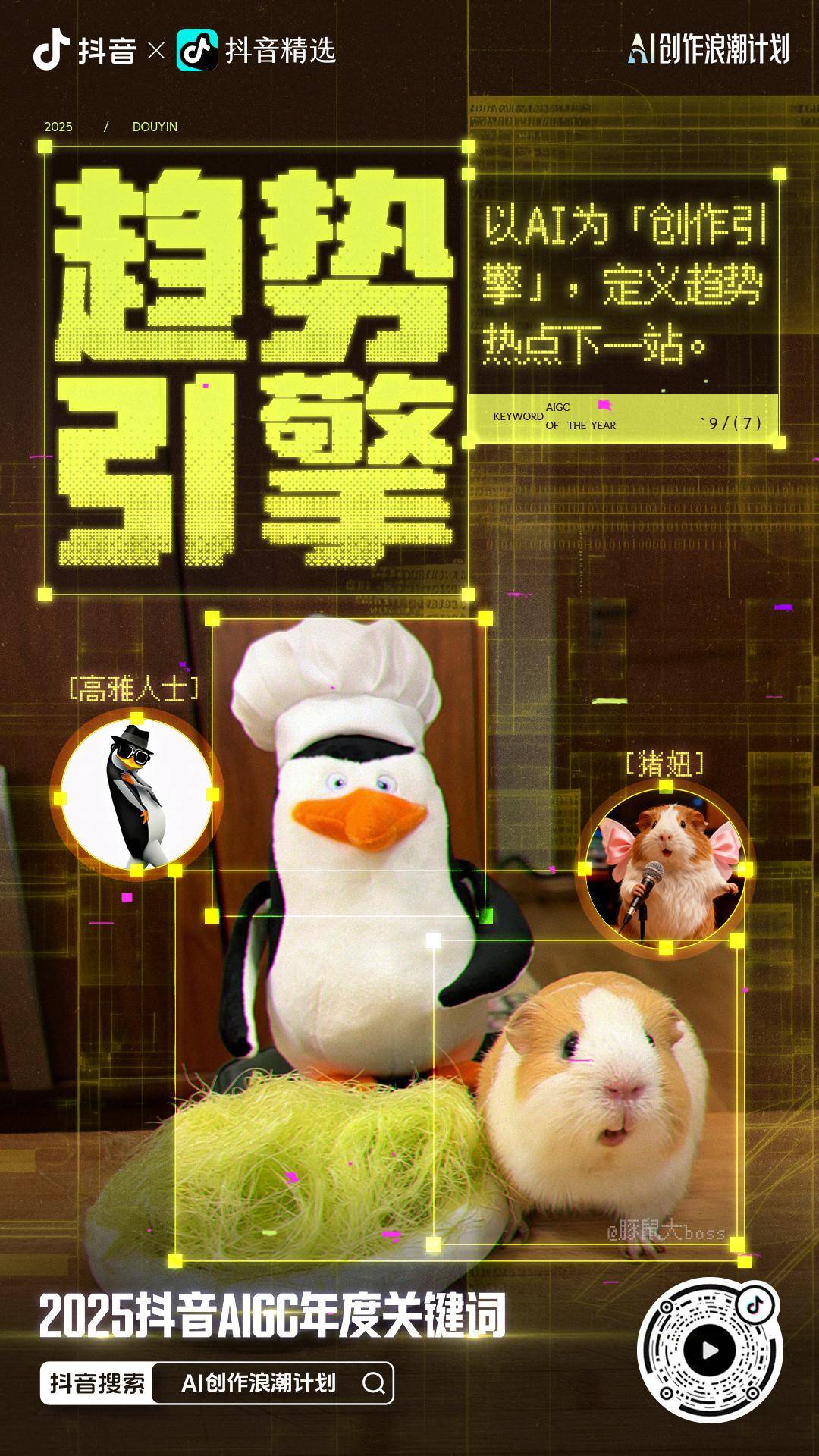 去年底,抖音发布了9个AIGC年度关键词,其中包括全民导演、人机交互、叙事奇点、风格开源、次元融合、时空在场、趋势引擎、文化新生和生态赋能等。抖音官方解释说,风格开源是指在AI的帮助下,创作不再局限于单一的美学标准,画面可以写实,也可以抽象;可以融合国潮元素,也可以探索未来的想象,满足不同审美需求并并行发展。而次元融合则意味着现实与虚拟、经典与新作、个人与IP之间的界限被打破,AI赋予了二次创作更大的自由度,不同的IP能够在这里被再创作、再演绎。趋势引擎则指AI加速了内容的生成、验证与传播,使得趋势不再是偶然发生,而是被持续推动。