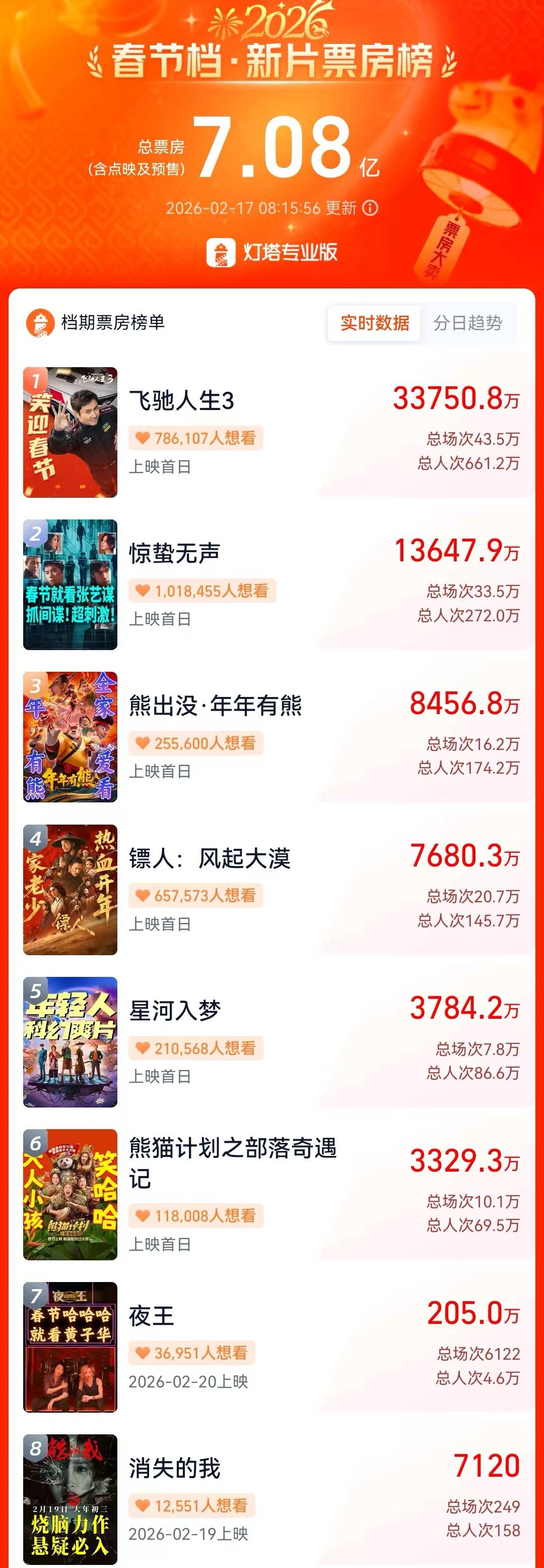 《星河入梦》《熊猫计划之部落奇遇记》预售票房各3784万元、3329万元,落在后面。《熊猫计划之部落奇遇记》在六部热片中稳稳垫底。