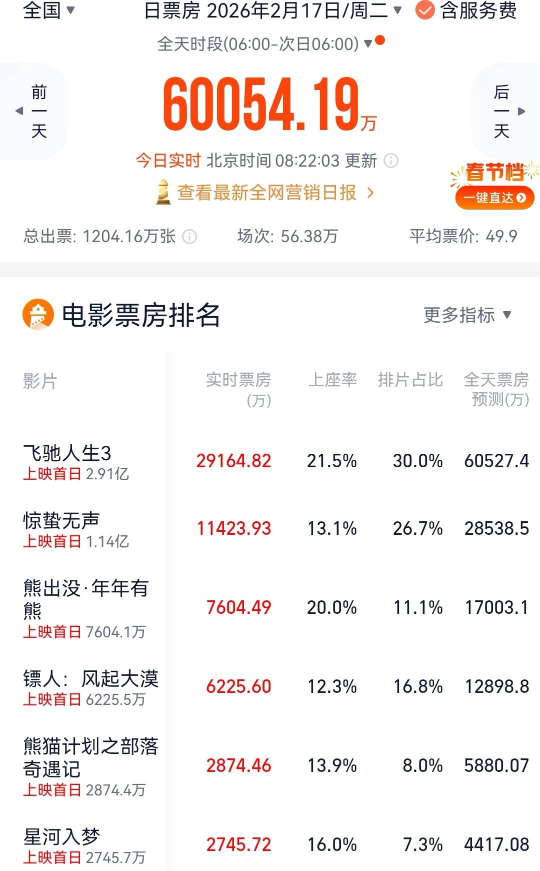 大年初一预售票房6亿元,《飞驰人生3》《惊蛰无声》《镖人》《熊出没·年年有熊》《熊猫计划之部落奇遇记》《星河入梦》预排片占比各30%、26.7%、16.8%、11.1%、8%、7.3%,《飞驰人生3》《熊出没·年年有熊》上座率领先。