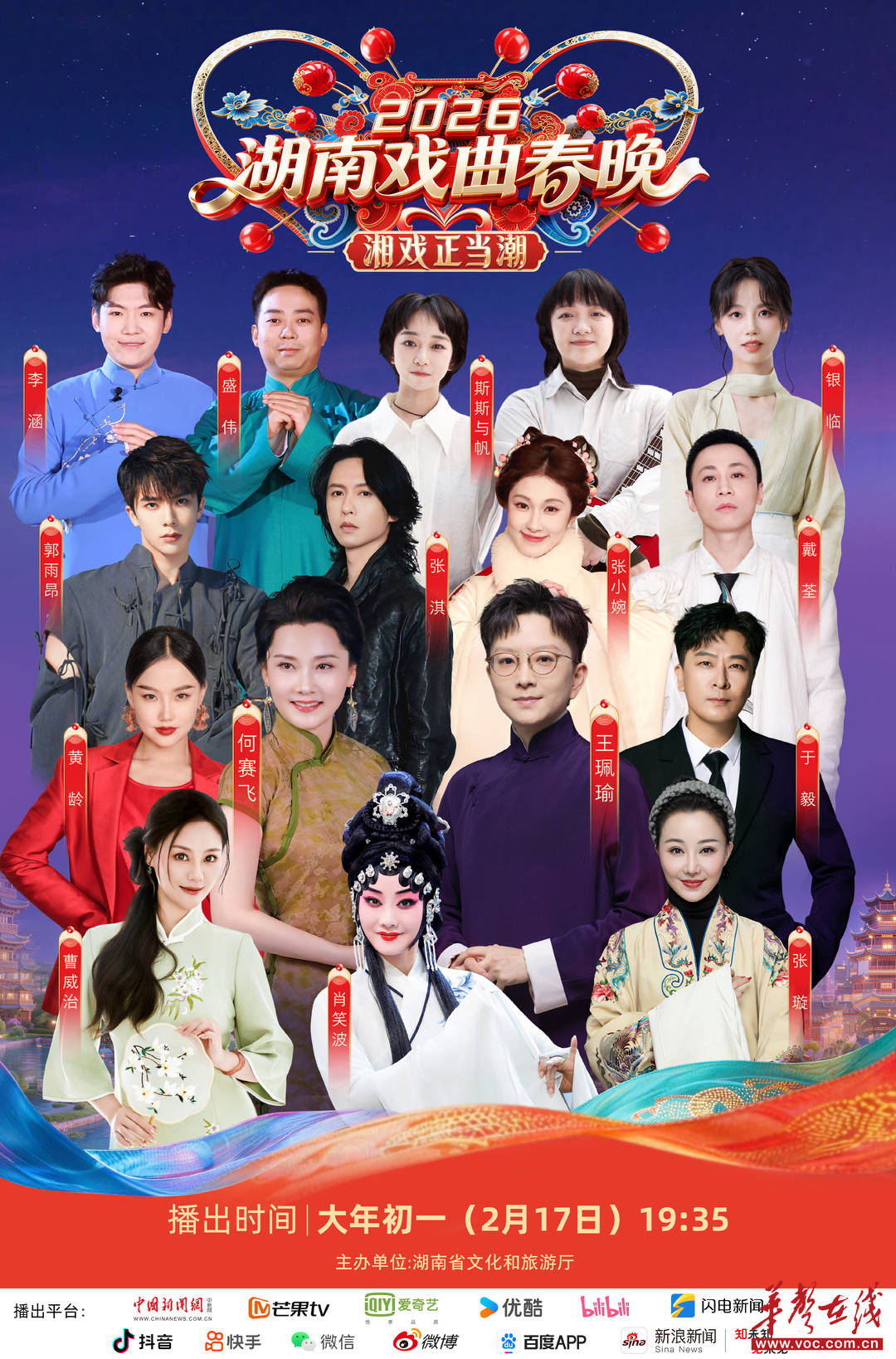 华声在线2月17日讯(全媒体记者 王梓槐)今天19:35,2026湖南戏曲春晚将正式开播。晚会以“湘戏正当潮”为核心主题,在长沙铜官窑及常德河街等地实景录制,旨在打破艺术边界,通过一场深度融合传统戏韵与时代创意的文化盛宴,为全国观众献上独具湖湘风情的新春祝福。