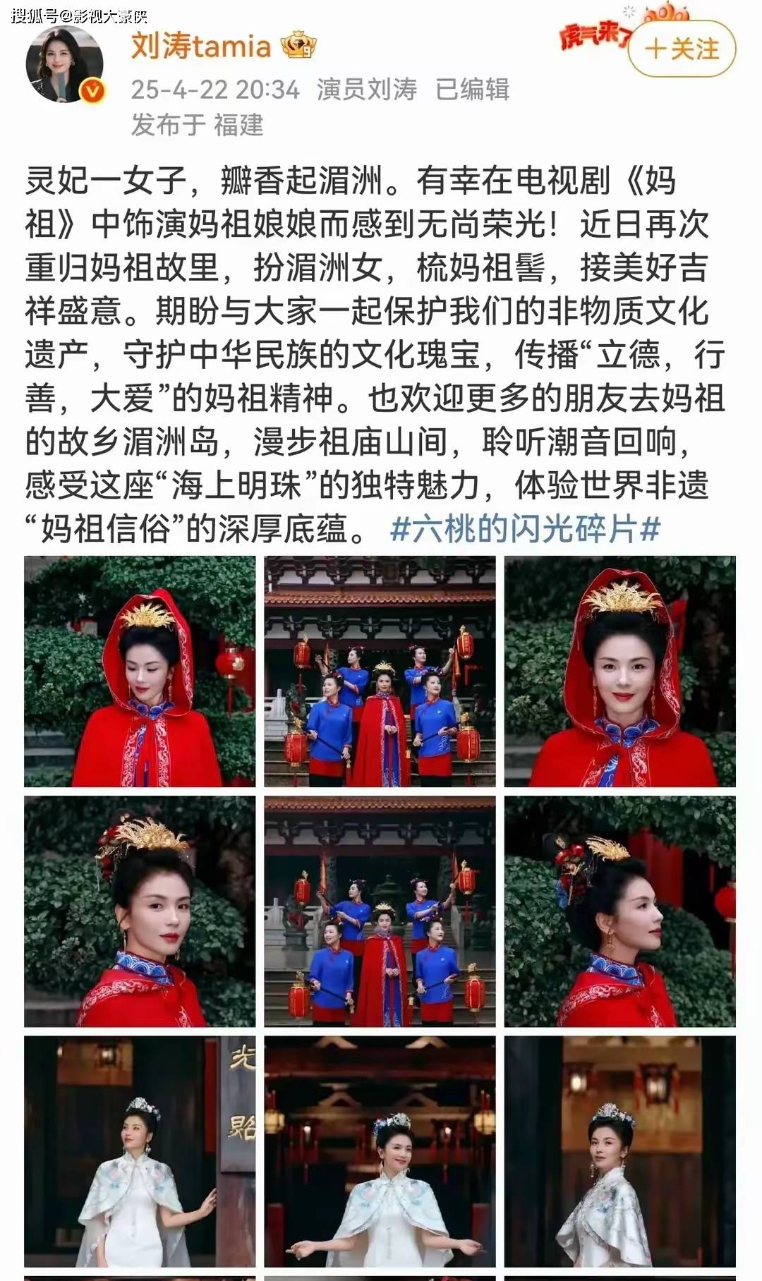 从2012年出演《妈祖》至今,刘涛的这一版形象早已深入人心。端庄大气、眉眼慈悲,自带一种让人安定的力量,也让她成为大众心中最贴合的“天选妈祖”。多年来,她始终对妈祖文化心怀敬畏,不消费、不娱乐、不过度绑定,还积极参与妈祖文化宣传,用行动传递善意与守护。