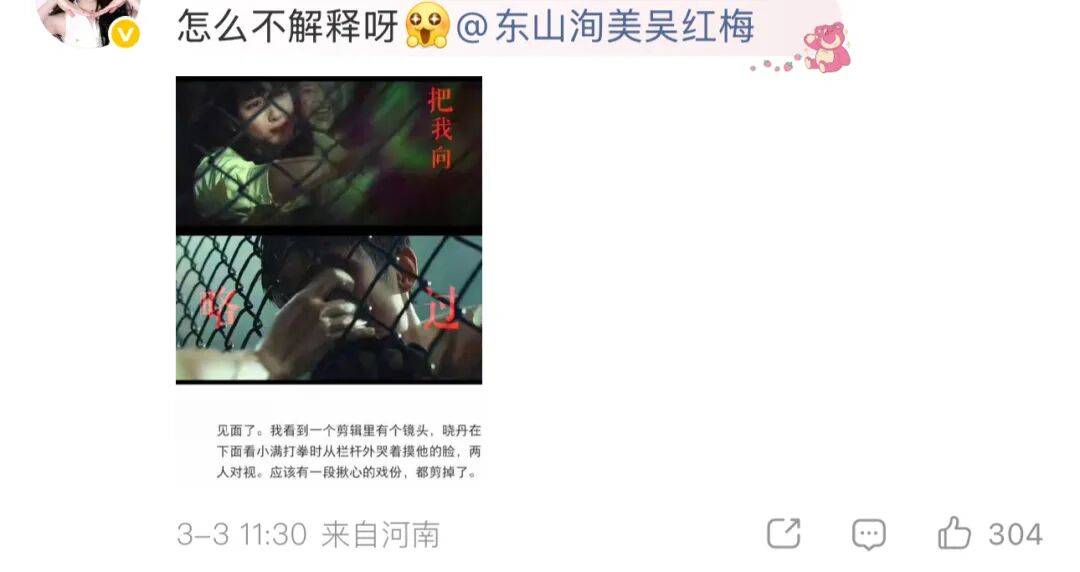 就算真的有戏份删减,合理的解决办法明明有很多。你可以解释是因为集数限制、剪辑时长不够;可以说是为了整体剧情节奏、群像平衡做出的调整;可以诚恳道歉、安抚粉丝情绪;哪怕什么都不说,保持沉默,都比现在这样强。