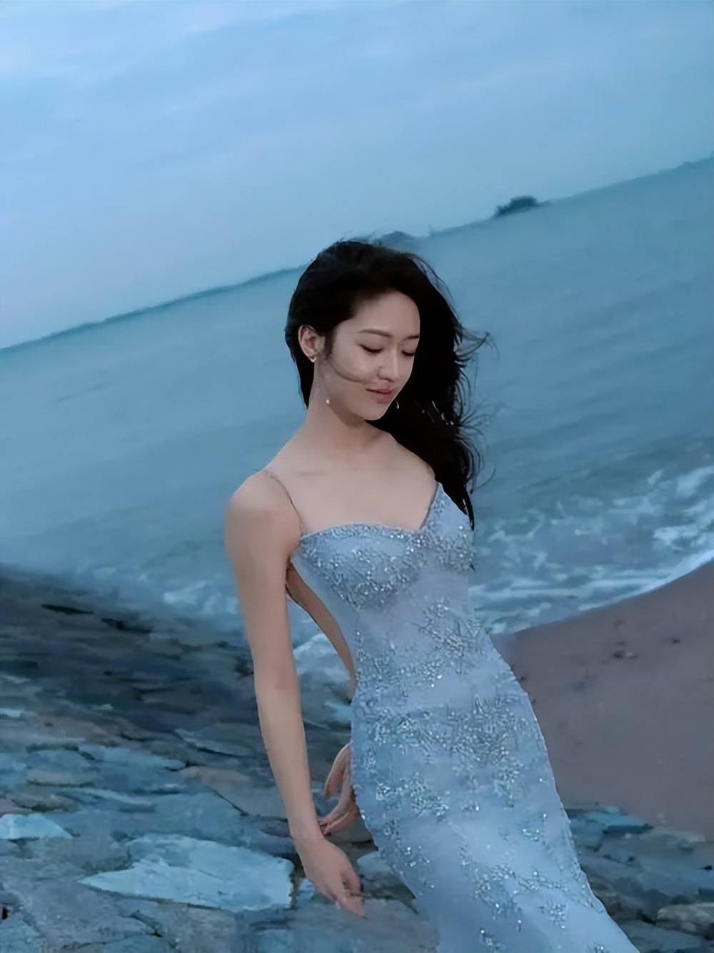 再如这张写真,向涵之穿着蓝色抹胸纱裙,她在河边走路时候,俏脸低垂,长发飘逸,露出白皙的香肩和事业线,凹凸有致的曼妙身材绝对性感撩人!