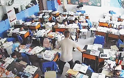 “蹲下,扶住桌子,冷静。”明宗龙一边扶住课桌保持身体稳定,一边反复确认学生的情况。
