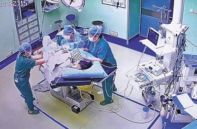 在瑞丽市人民医院,手术台在地震中晃动。主刀医生杨继平第一时间护住患者,手术室外的两名医护人员也扶着墙踉跄地冲进来,一前一后扶住手术台。数人齐力,稳稳护住了患者。