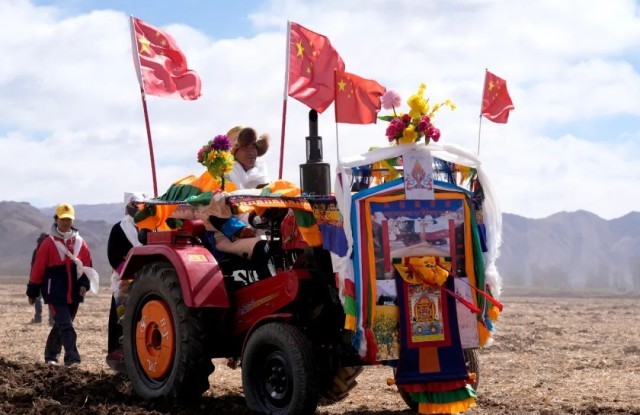 2025年3月16日,西藏拉萨强嘎乡春耕仪式现场。拖拉机被盛装打扮,祈求风调雨顺、农业丰收。中新社记者 李林 摄