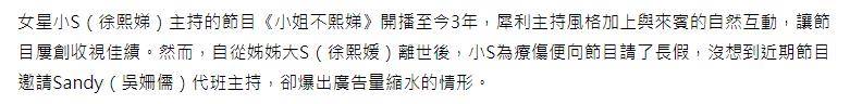 4月14日,台媒称离开了小S(徐熙娣)的节目《小姐不熙娣》收视下降,并且广告投放也开始严重缩水。