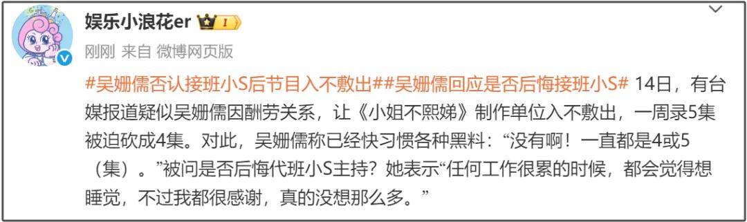 而面对台媒突然说自己主持费有问题,吴珊儒连忙否认《小姐不熙娣》制作组入不敷出,表示一直都是“4集或5集”,被问是否后悔代班时,她称“不会想那么多,都很感谢”,而且也已经习惯了各种黑料,言外之意就是砍广告等消息都是黑她的。