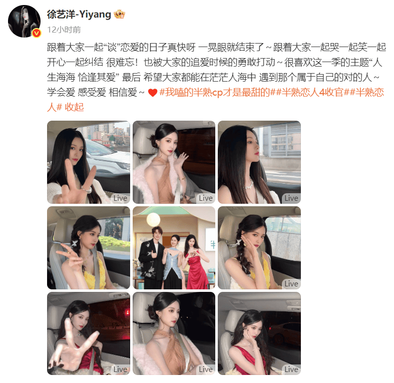 5月13日,恋爱综艺《半熟恋人4》正式收官。“半熟”观察员徐艺洋在社媒上发文谈恋爱感悟。